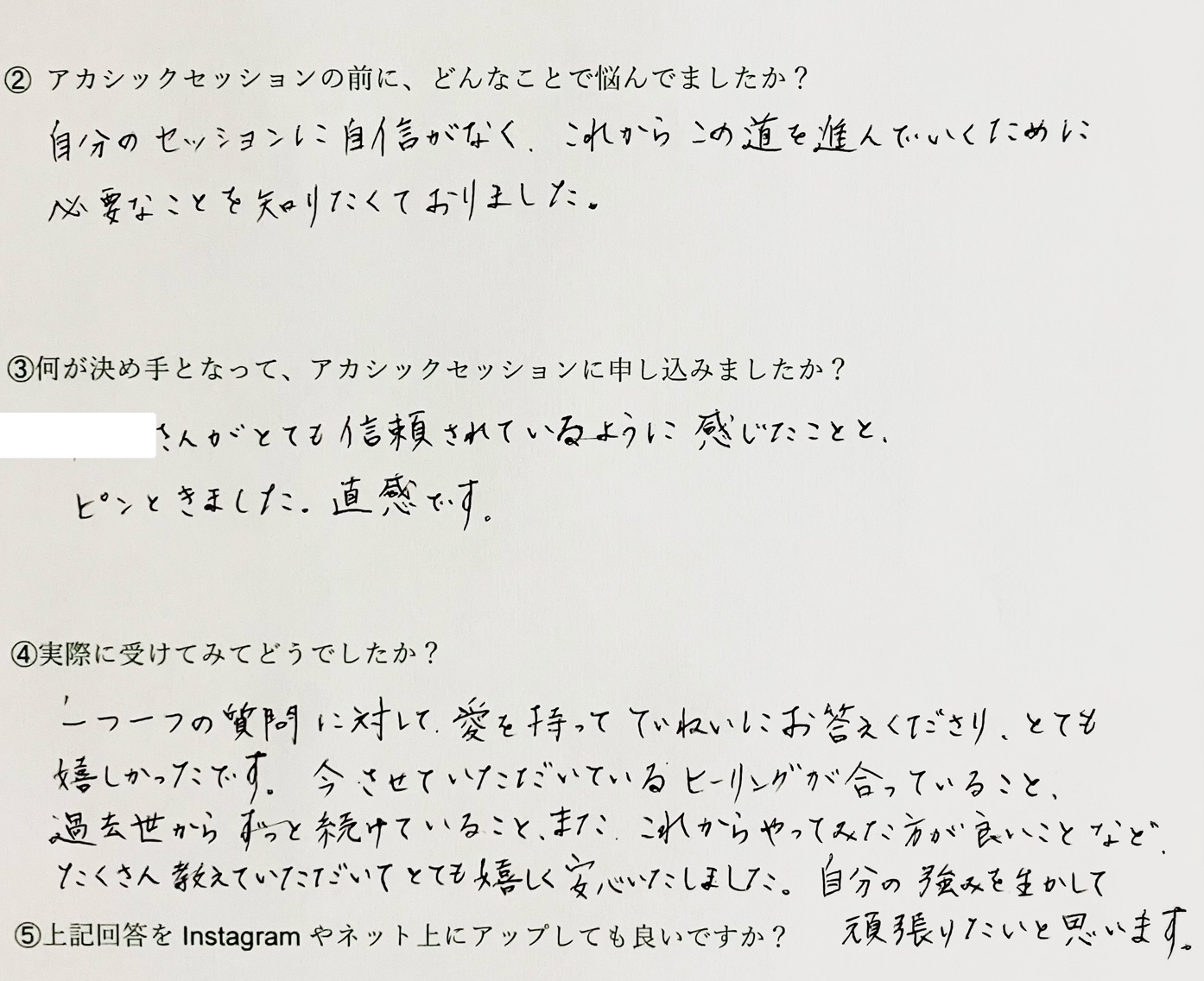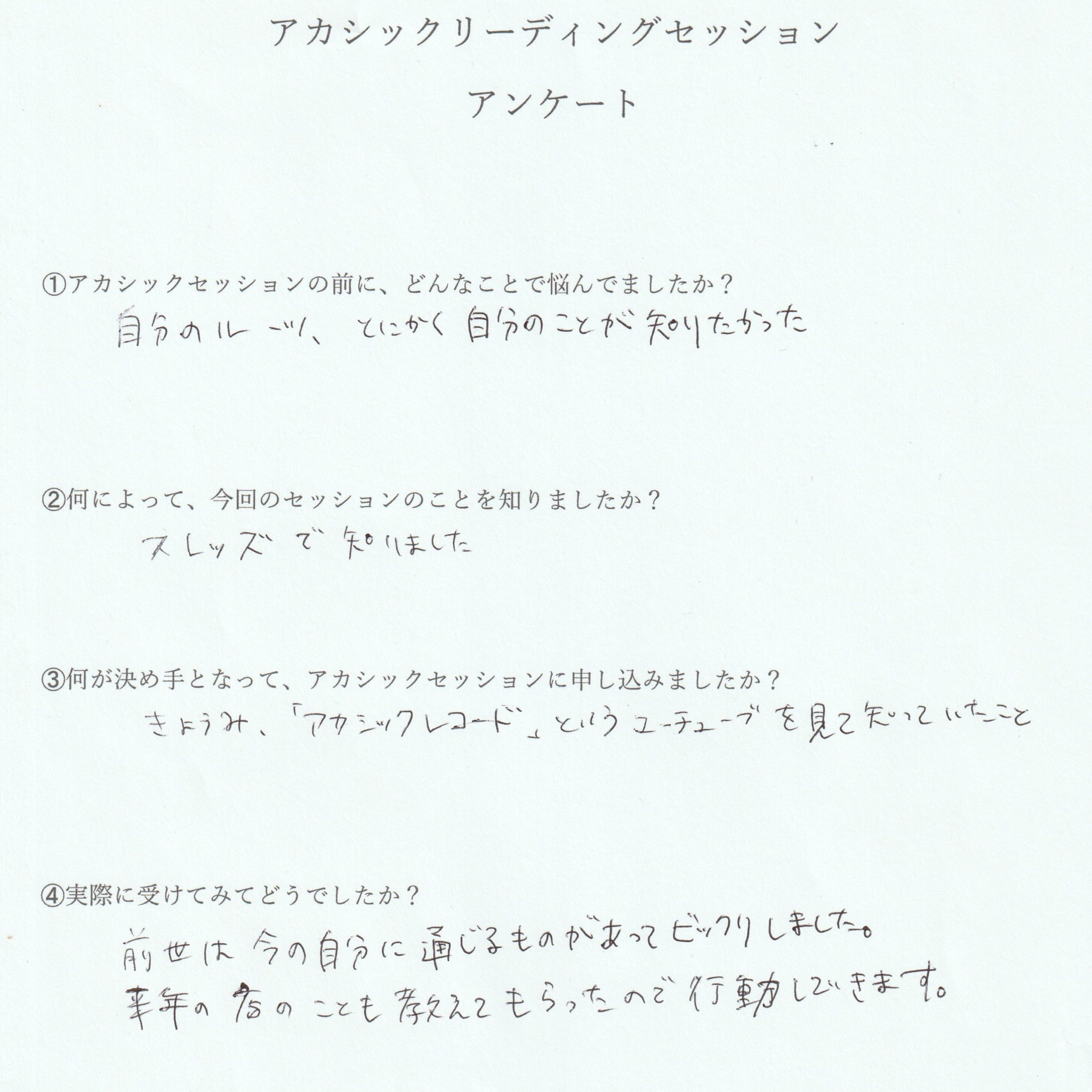 「リーディングを受けるのが初めてだったので、ドキドキしました!!どんどん思い当たることの言葉が出てくるので、自分の中で納得する部分がありました。本当に不思議な体験でした😊😊」(A様)